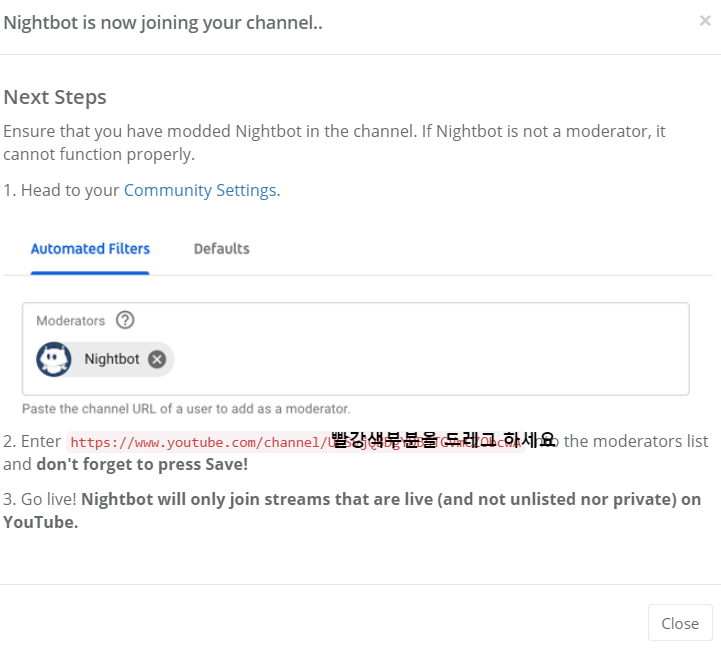실시간 스트리밍 시작을 눌러 실시간을 켜주시고 icommads라고 문구를 치면은 나이트봇이 영어로 뭐라고 말을 하면은 성공입니다,