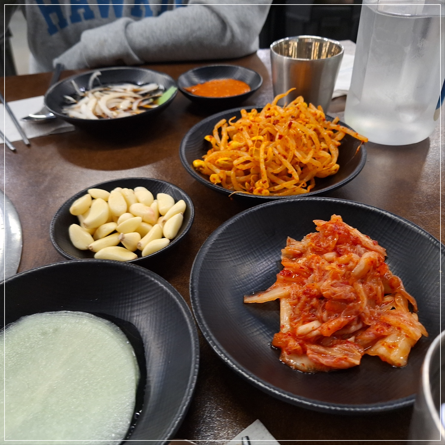 기본반찬: 콩나물, 김치, 마늘, 무쌈, 상추, 깻잎, 양파절임, 어묵탕, 계란찜